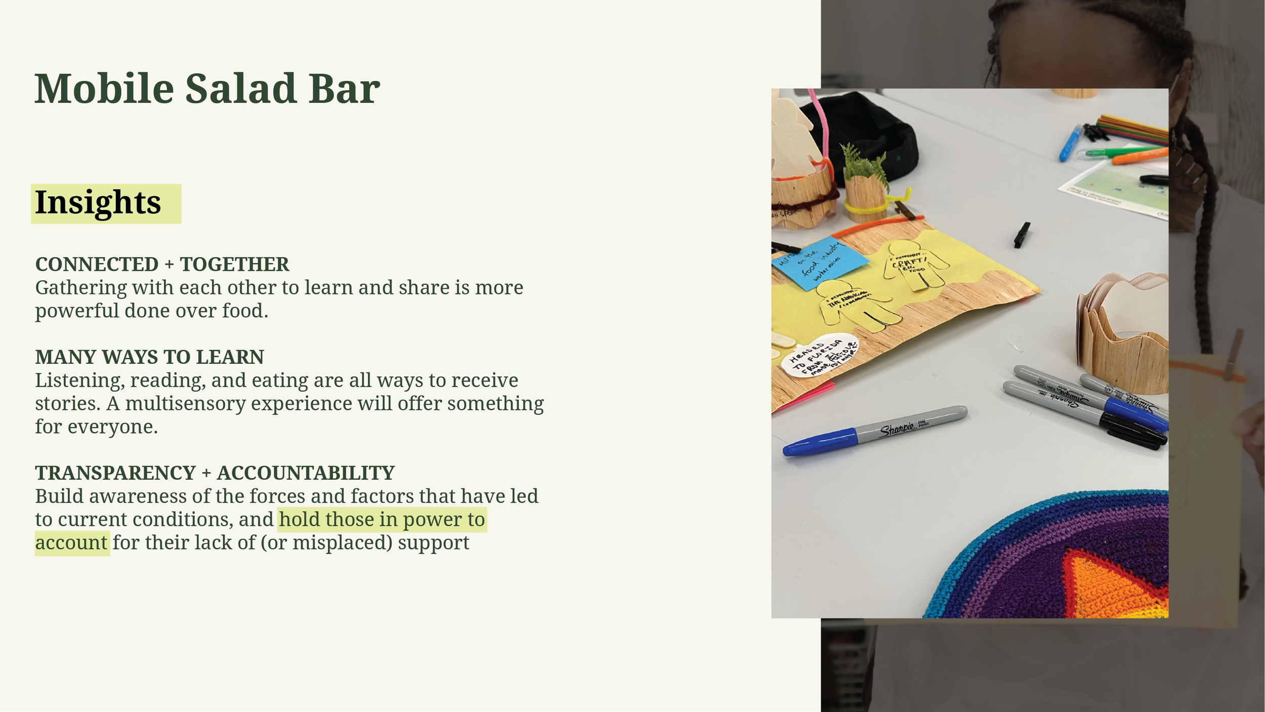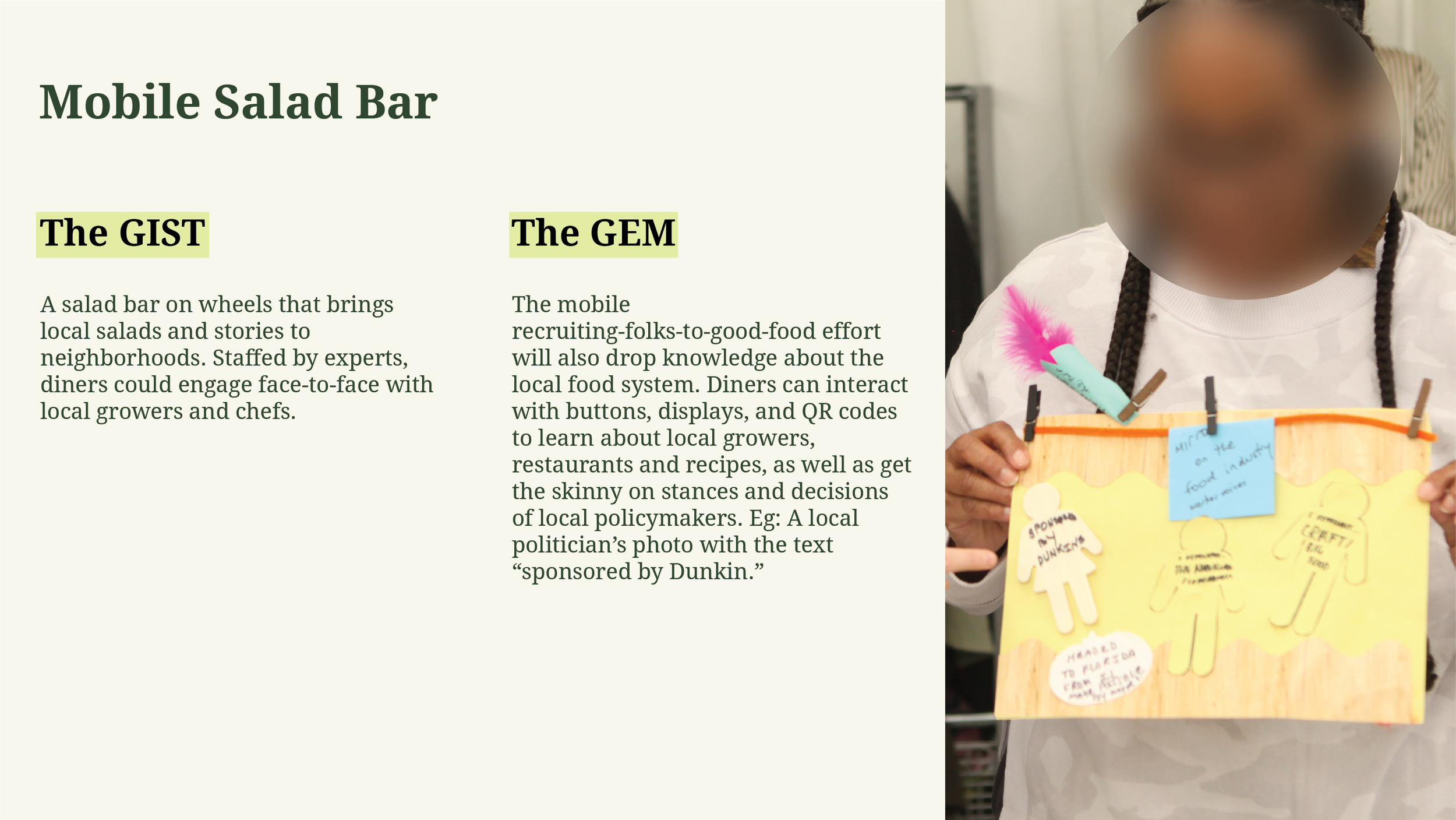 This project was a collaborative effort led by Cheryl Dahle's along with Community Food Navigator. Along with her, me, Anahita Dasgupta, and Andrew Russel. We conducted interviews, facilitated the session, and developed the final strategies under her guidance.