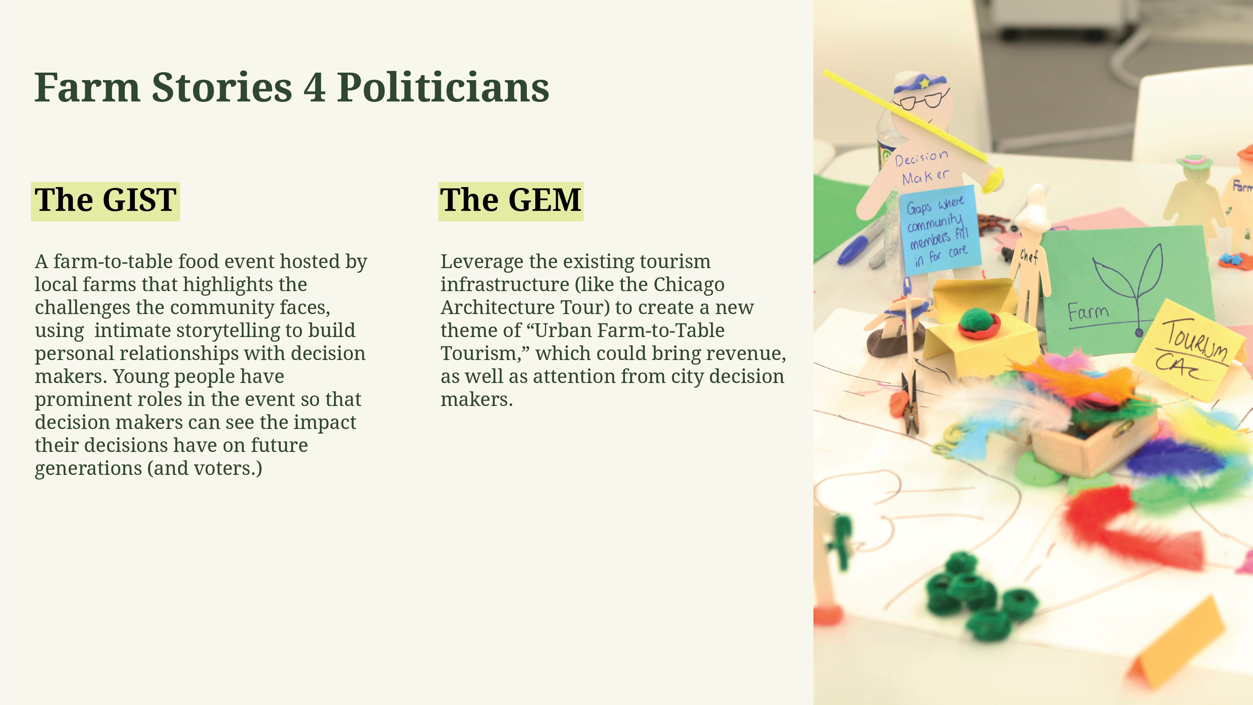 Participants were organized into 3-5 teams, each with the task of developing a representation of their idea, choosing either to perform a skit or to construct a diorama. The aim was to encourage teams to delve into the details of their concept, paying particular attention to the experience it would provide for their chosen target "user," whether that be themselves, the media, or policymakers.