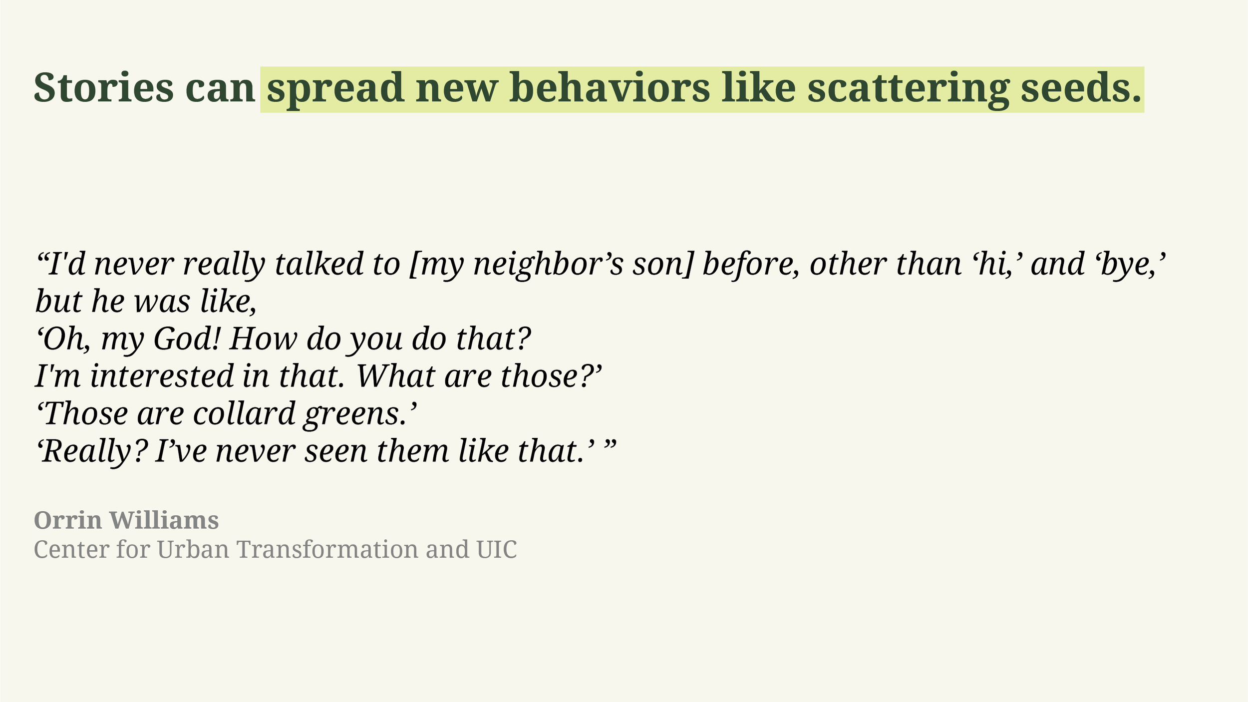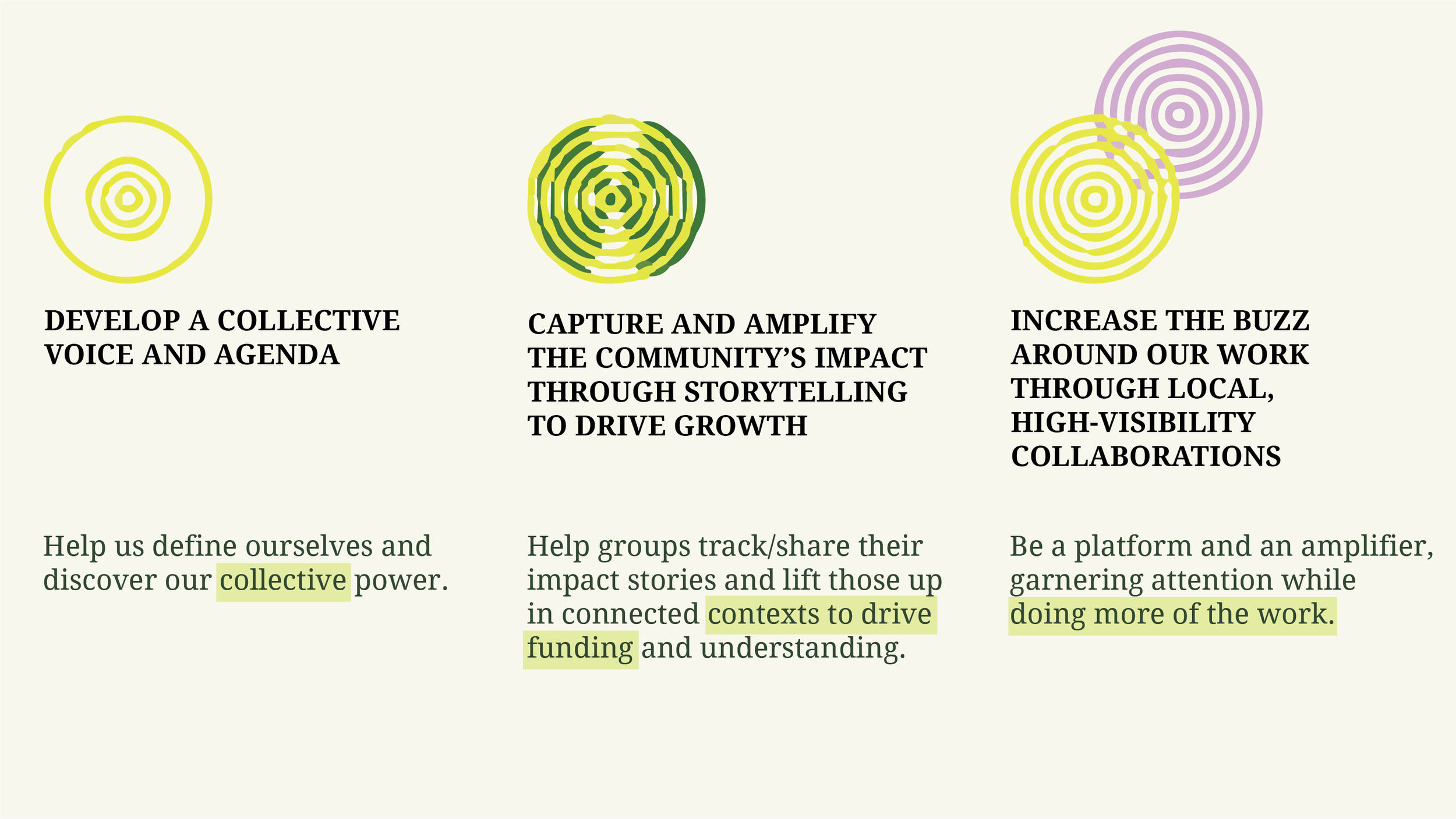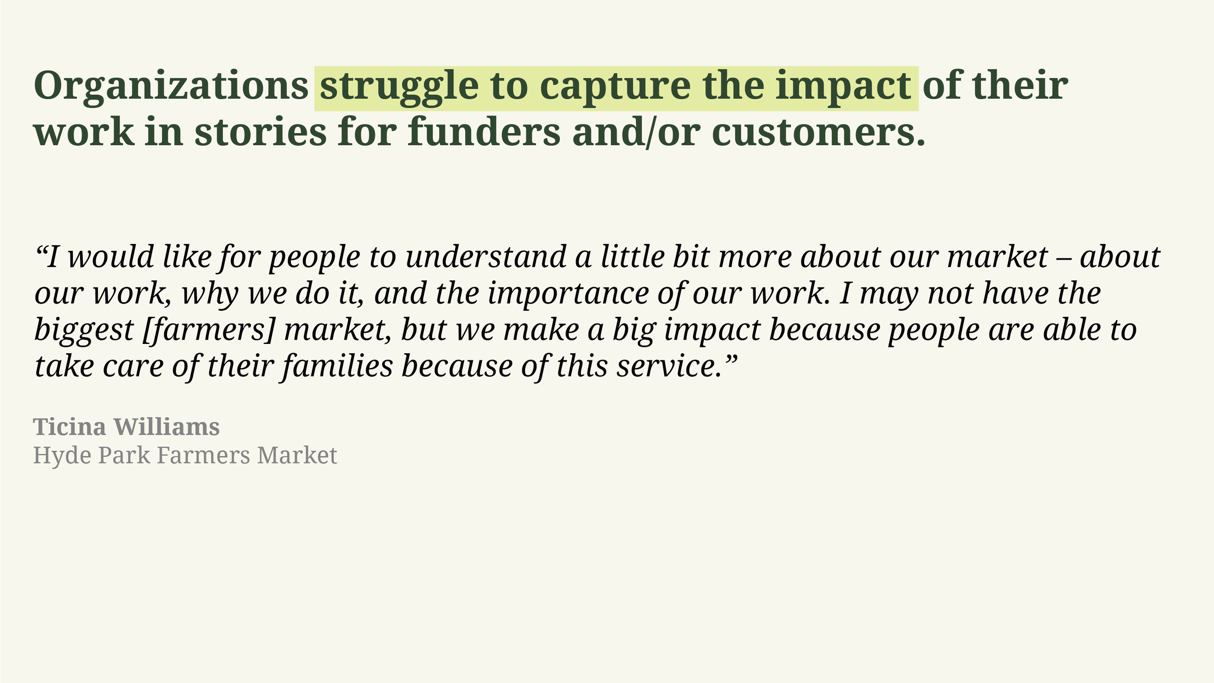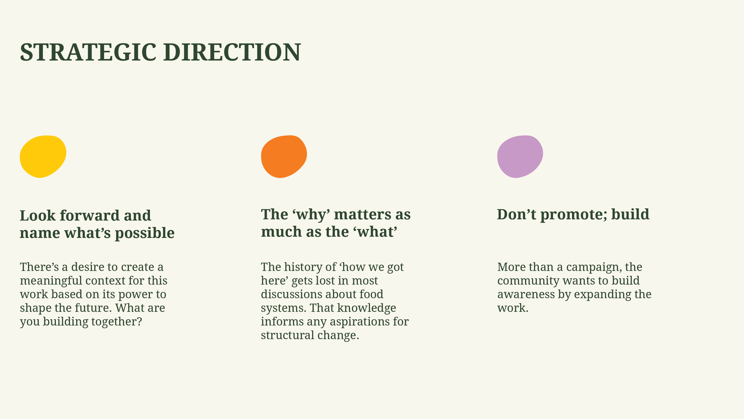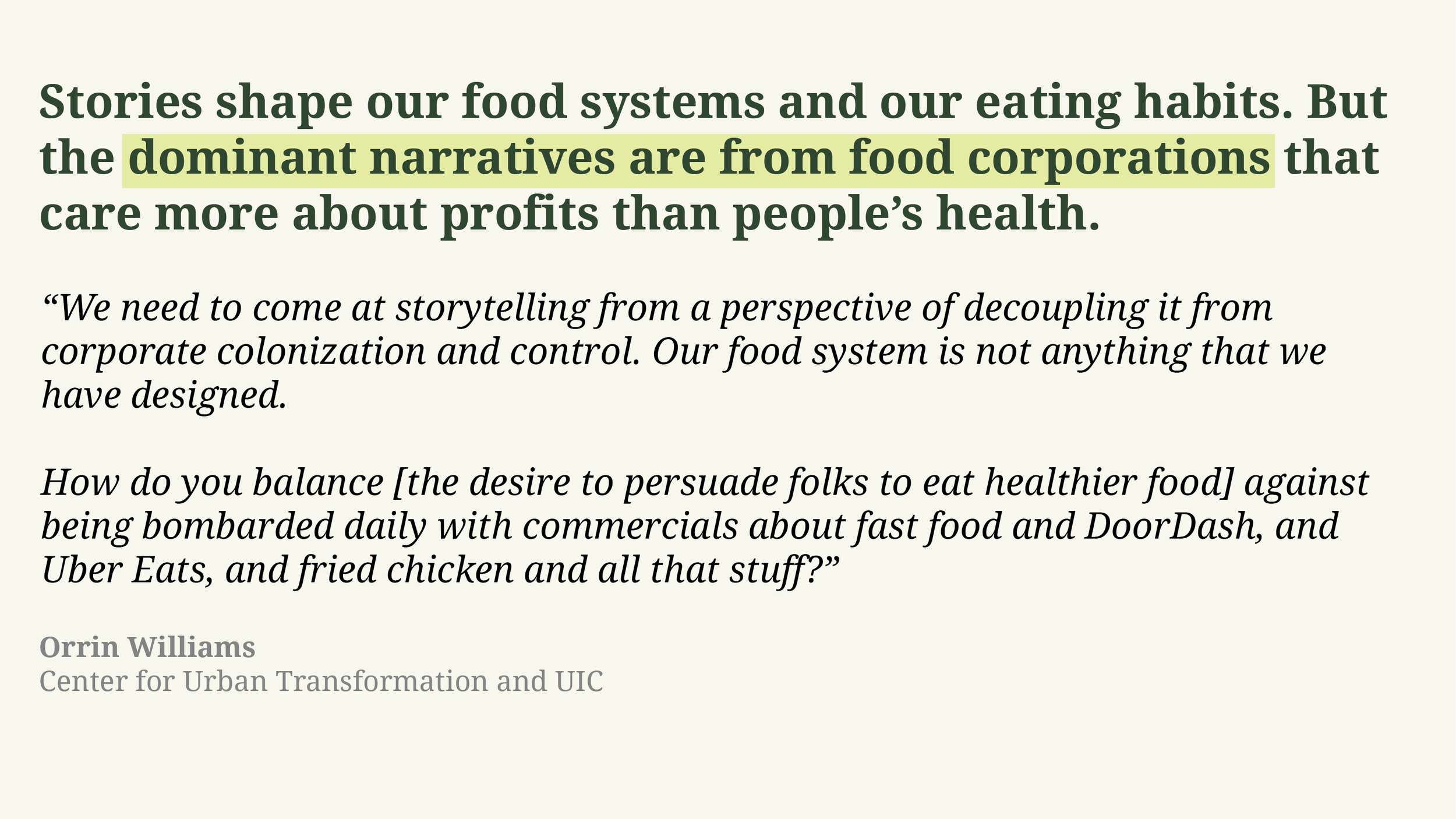 Community Food Navigator (The Navigator) is a local nonprofit organization that is a gathering hub and partner for food system organizations led by folks from the Black, Indigenous or People of Color communities. The Navigator extended an invitation to Cheryl Dahle and our team, keen on exploring the impact of storytelling from and about its stakeholders in fostering a deeper understanding and unlocking new possibilities for the network. This challenge is about more than marketing; it’s about finding ways that these organizations connect with each other, how they re-frame the public conversation about “food deserts” and create a narrative that can drive systems change.